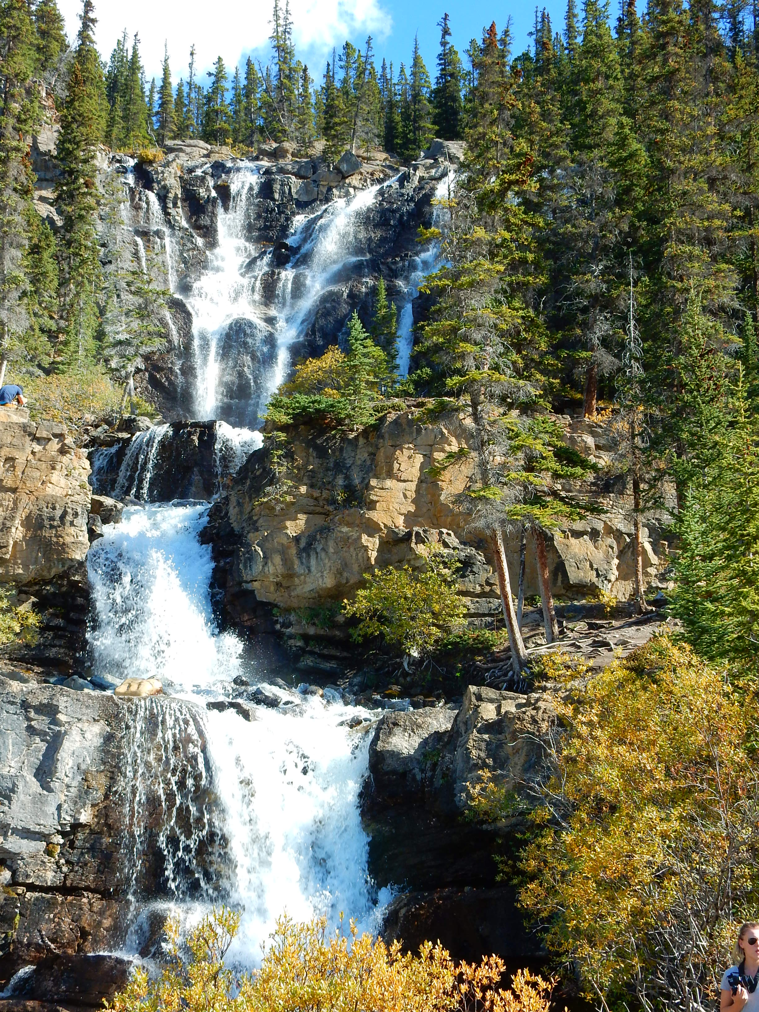 After breakfast we had a long drive ahead of us – 230 km south, from the Whistlers campground to Lake Louise.  The journey was lengthened by construction.  On the bright side, it allowed us to get out, stretch our legs and have a look at the waterfall in Tangle Creek at the side of the road.