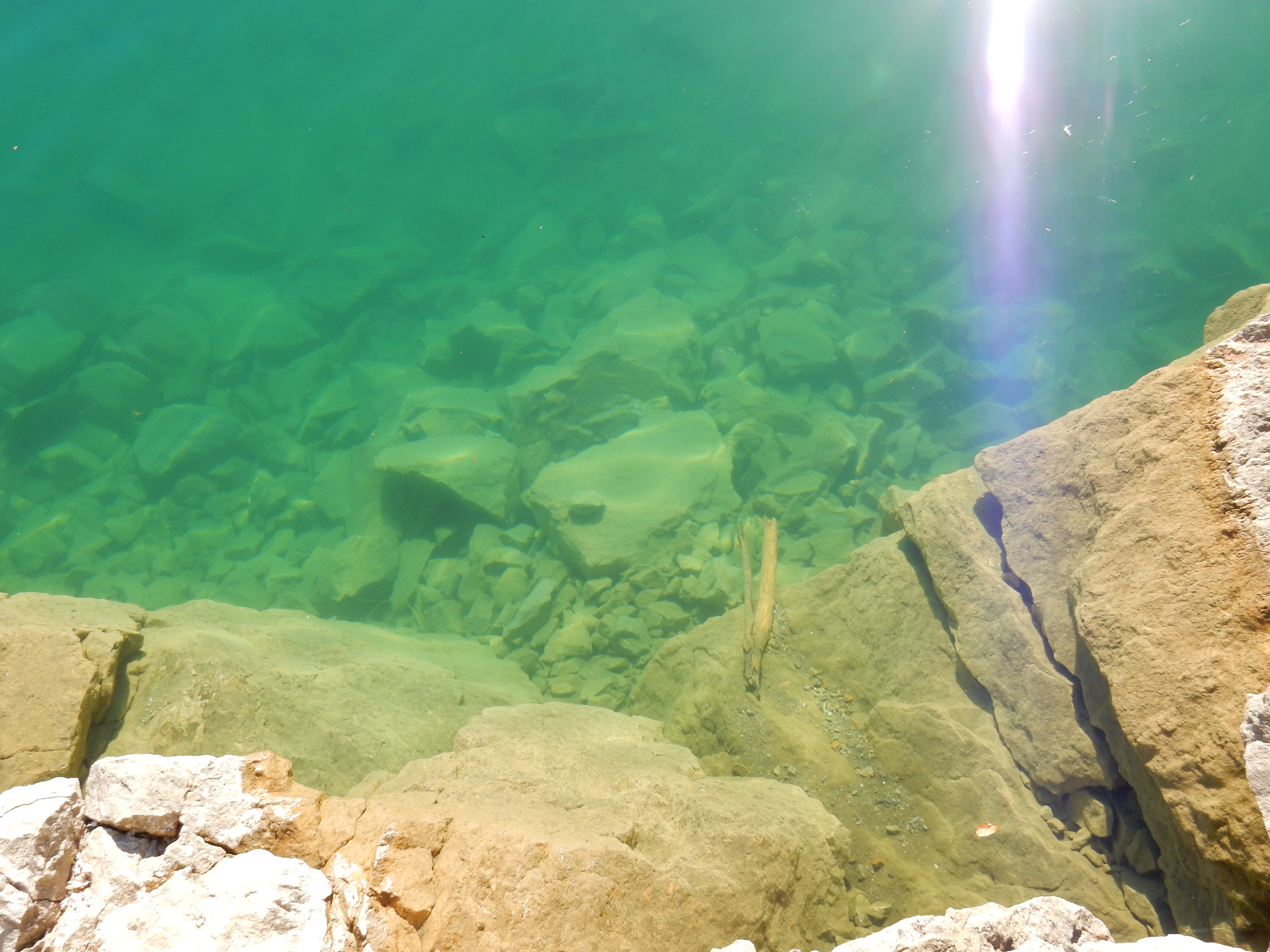 Julius and I took a drive around noon to “The Quarry”. According to local lore, this was the site of an old limestone quarry. At one point, the miners struck an aquifer and water rushed into the quarry. The water continued to flow, filling the area and forming a deep man-made lake. Here is the result of the flooding: