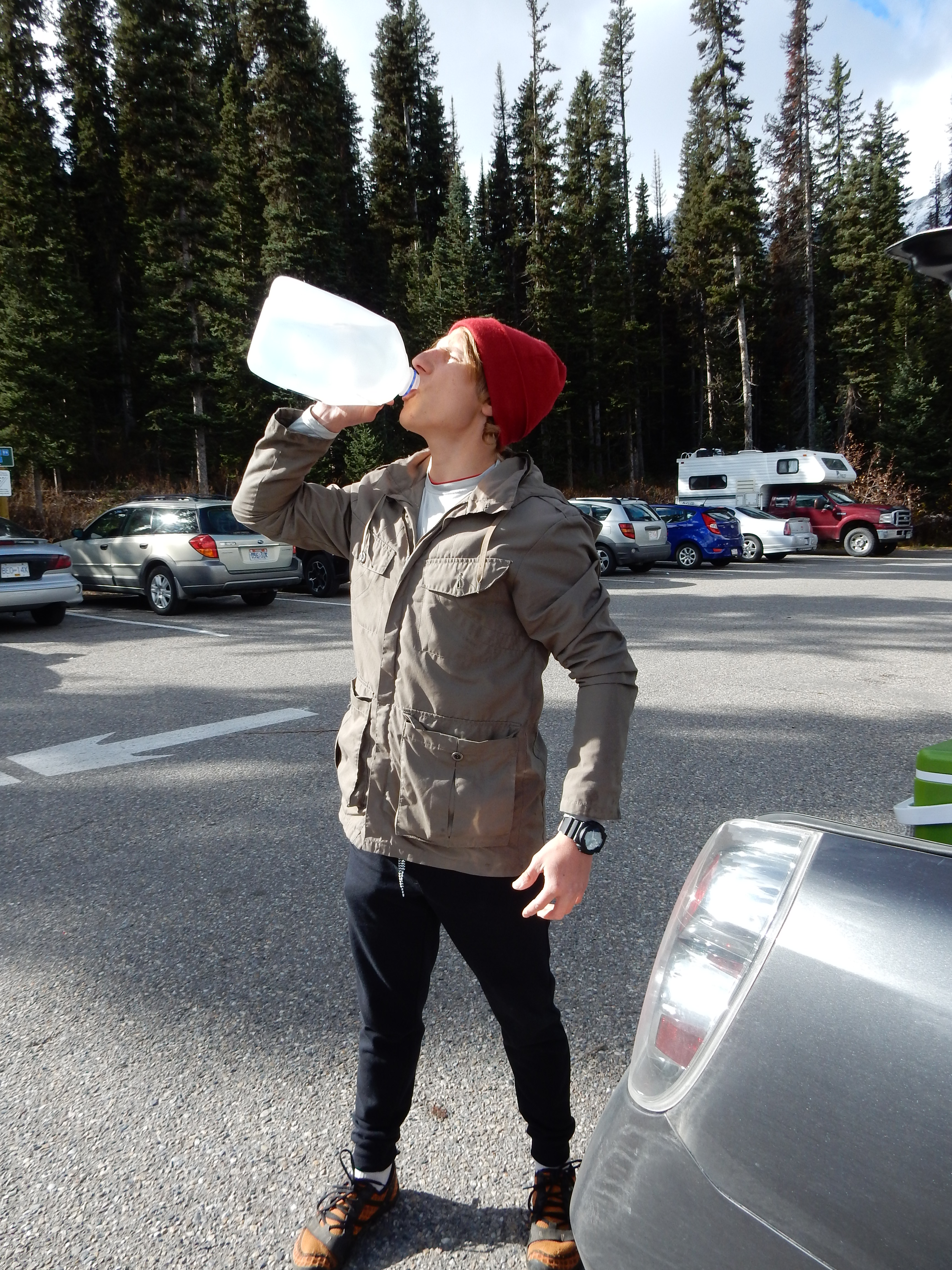 In Lake Louise, we found a lot less cars than there were when Kate and I visited in September. It must be the cold. We weren’t scared though – we were about to embark on an epic hike. However, it would not be before a “good-luck chug”.